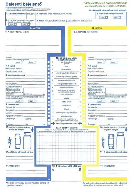 Fontos! Az Európai Baleseti Bejelentő nyomtatvány 14.-es pontjában (“Megjegyzés”) az okozó féllel mindenképp le kell íratni, hogy „A károkozásért a felelősségemet elismerem.”, illetve ezt alá is kell íratni az okozó féllel a 15. pontban (“A járművezetők aláírása”).